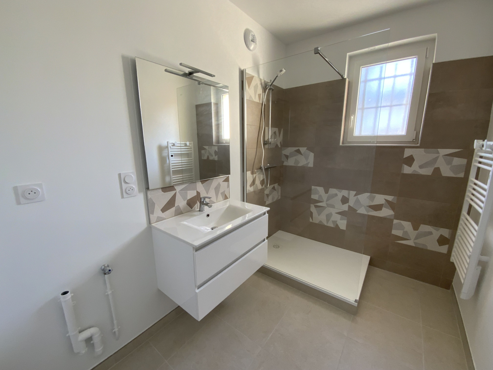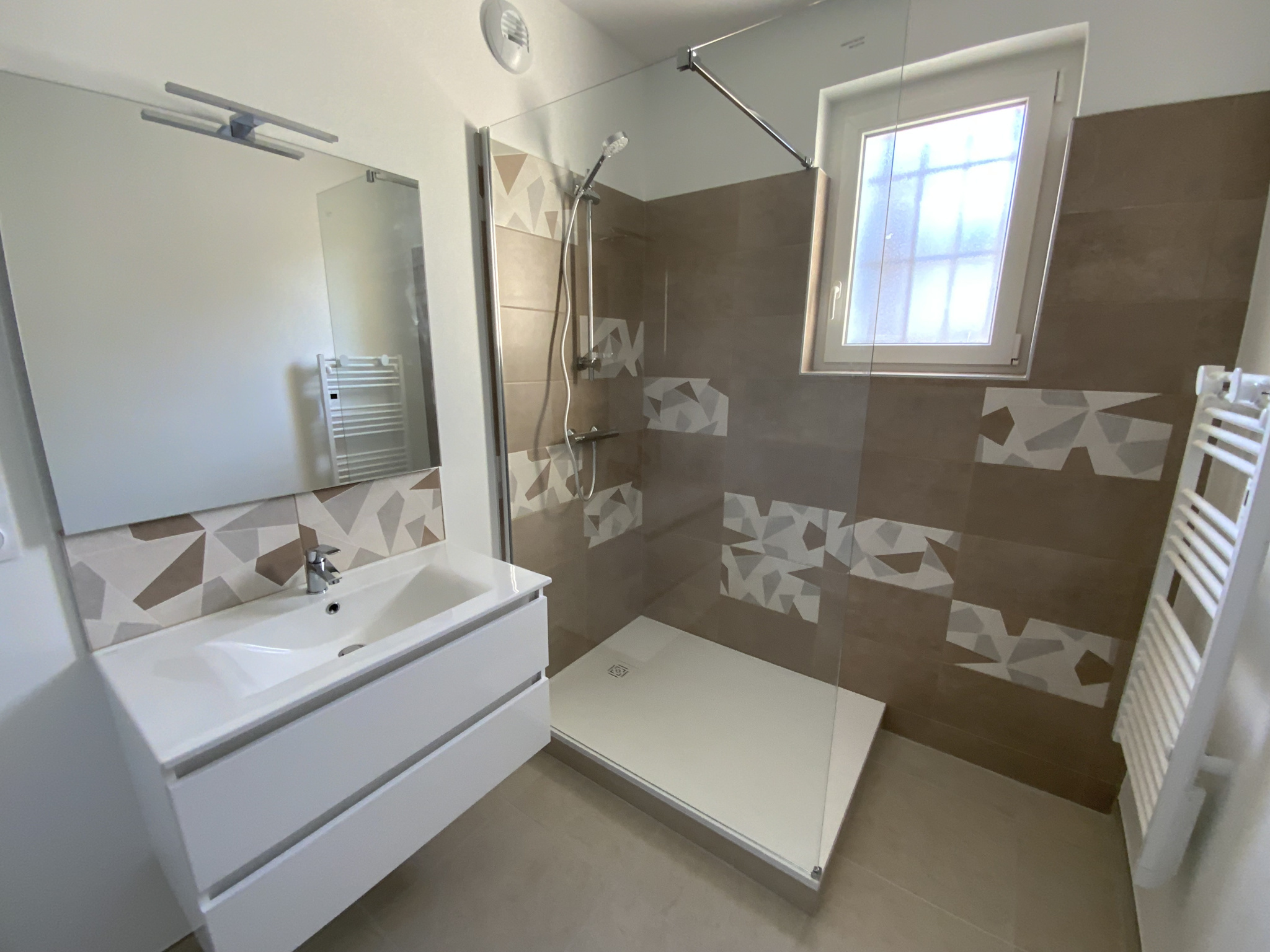 Il comprend : un double séjour-salon ; une cuisine schmidt équipée avec des plaques induction, une hotte aspirante, un évier, un raccordement lave vaisselle ; une salle de bain avec une spacieuse douche, raccordement lave-linge, meuble vasque et WC ; une chambre de 14 m²