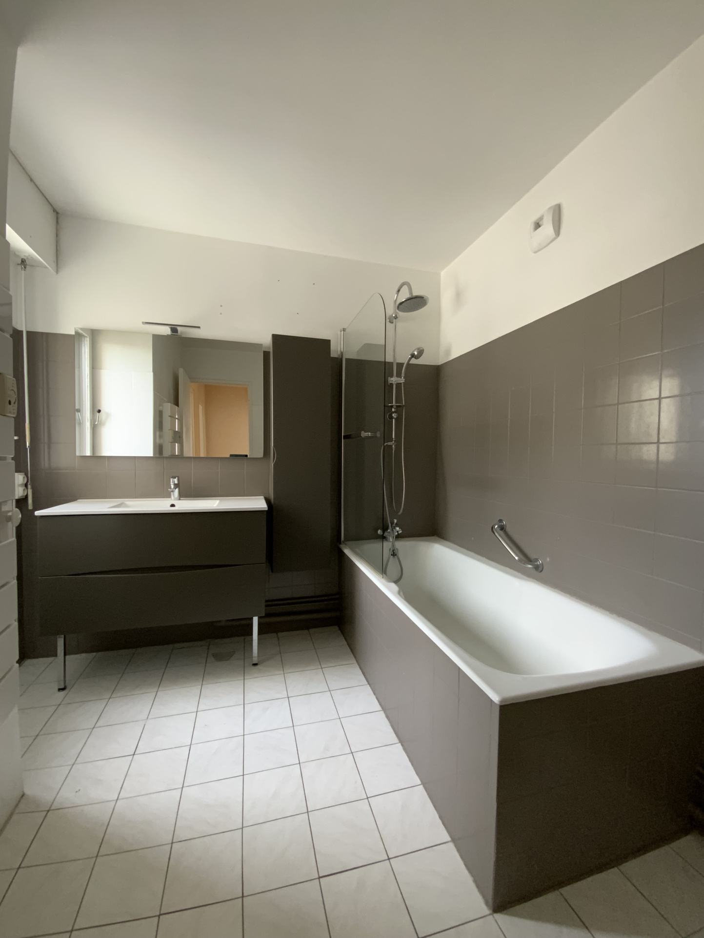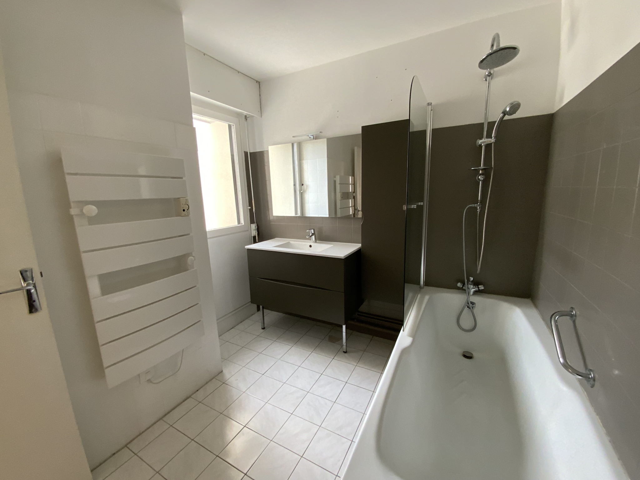 Une salle de bains équipée d'une baignoire avec paroi, meuble vasque, meuble de rangement, sèche-serviette électrique, et raccordement lave-linge.