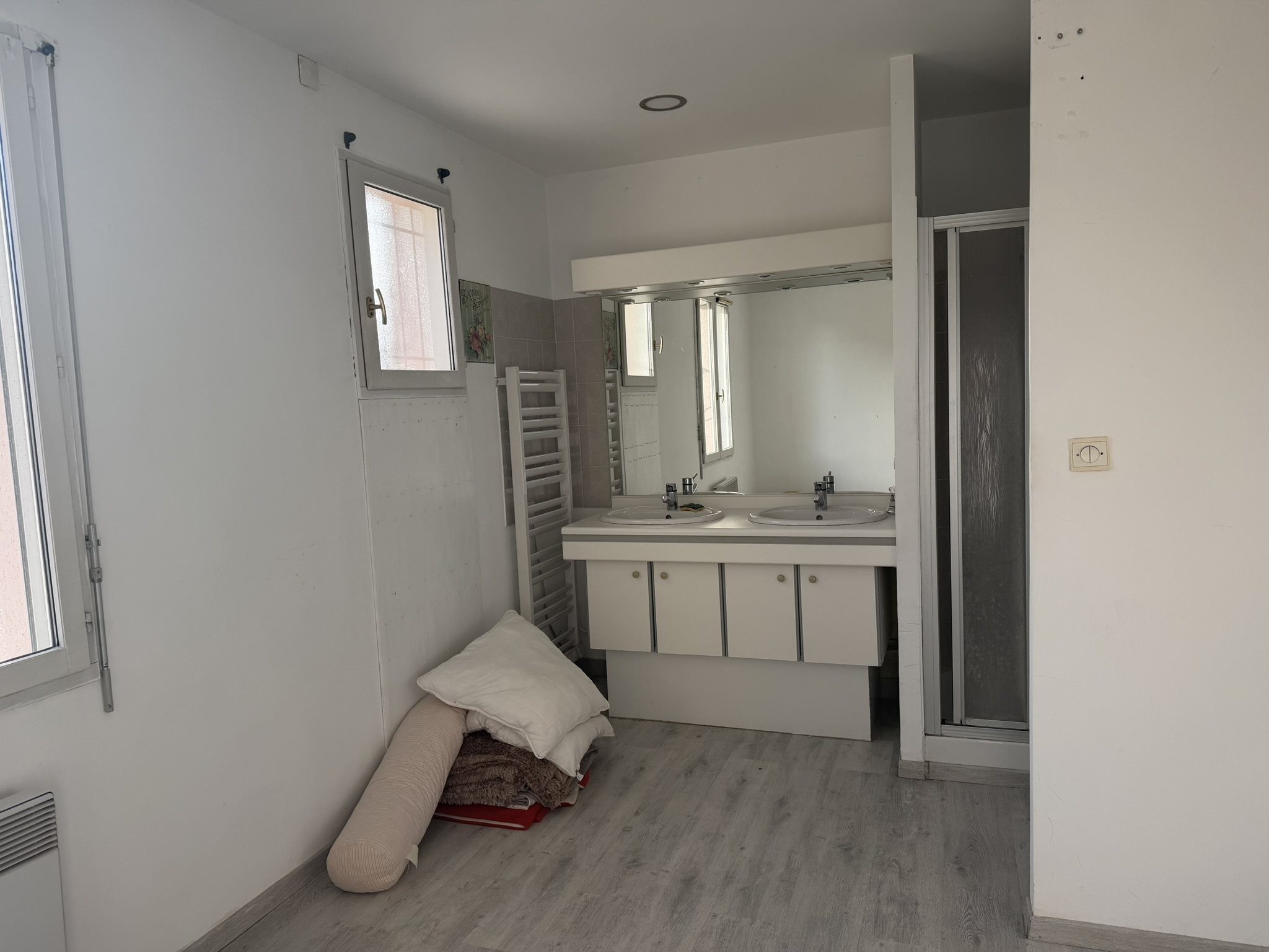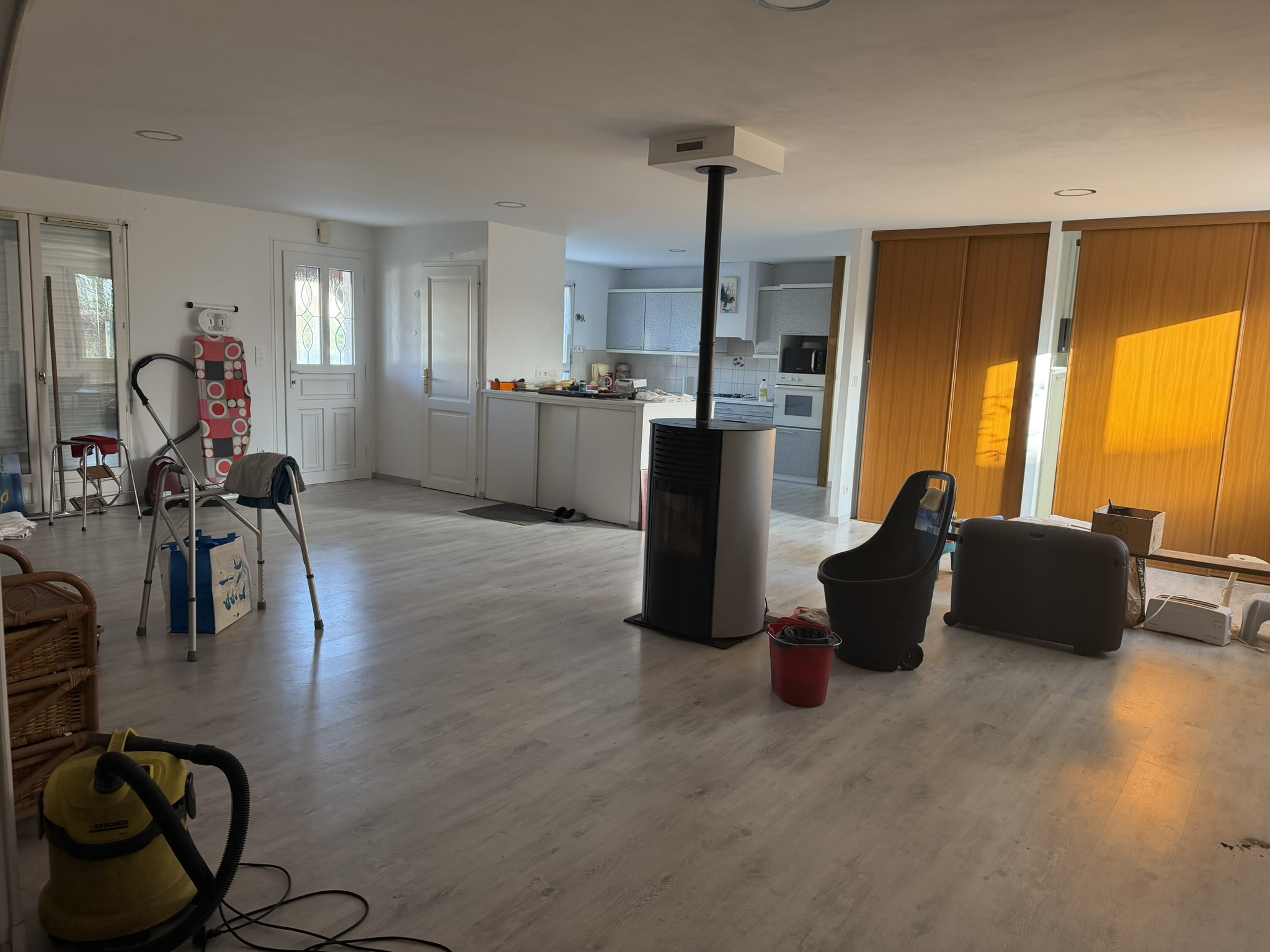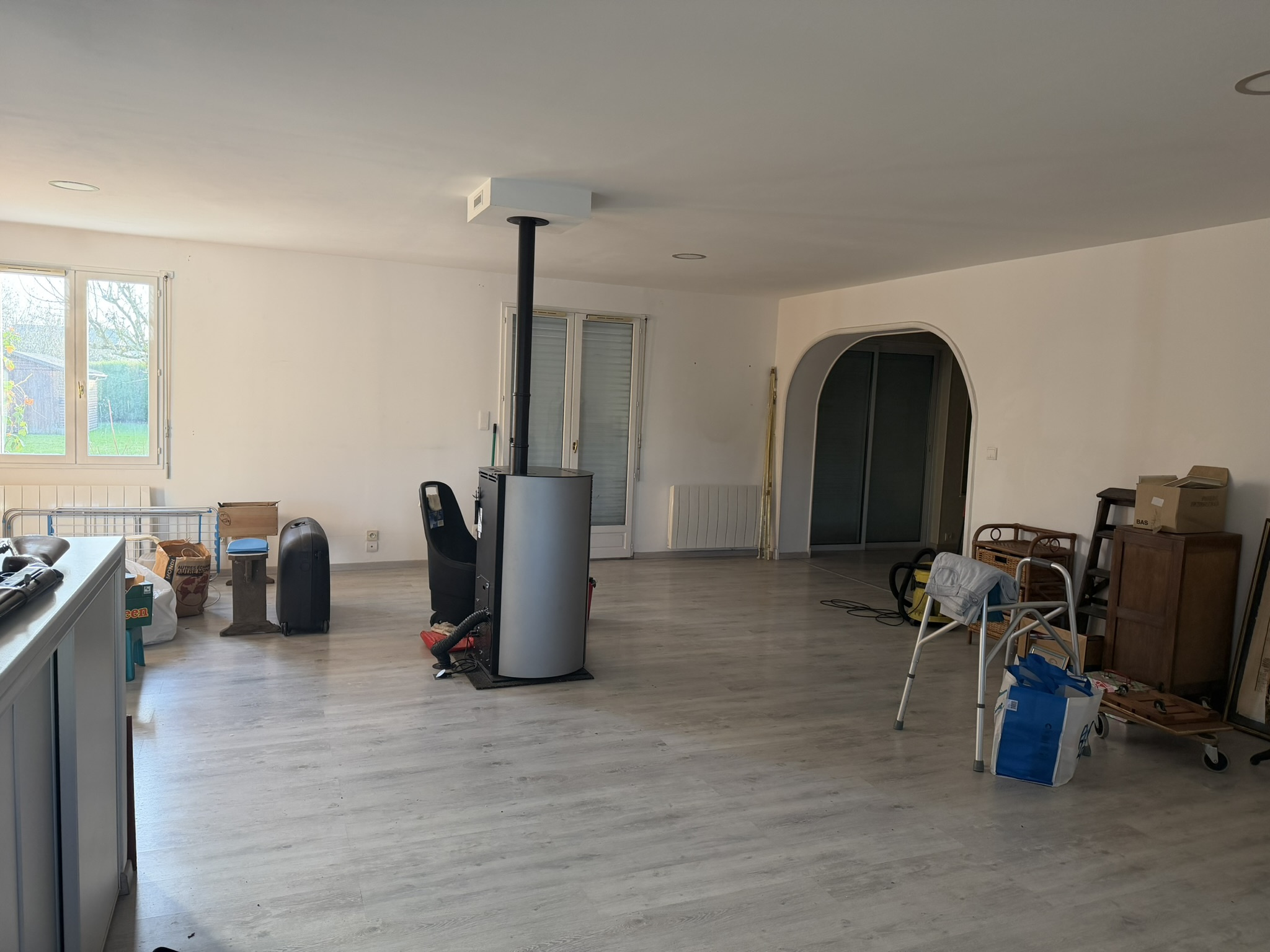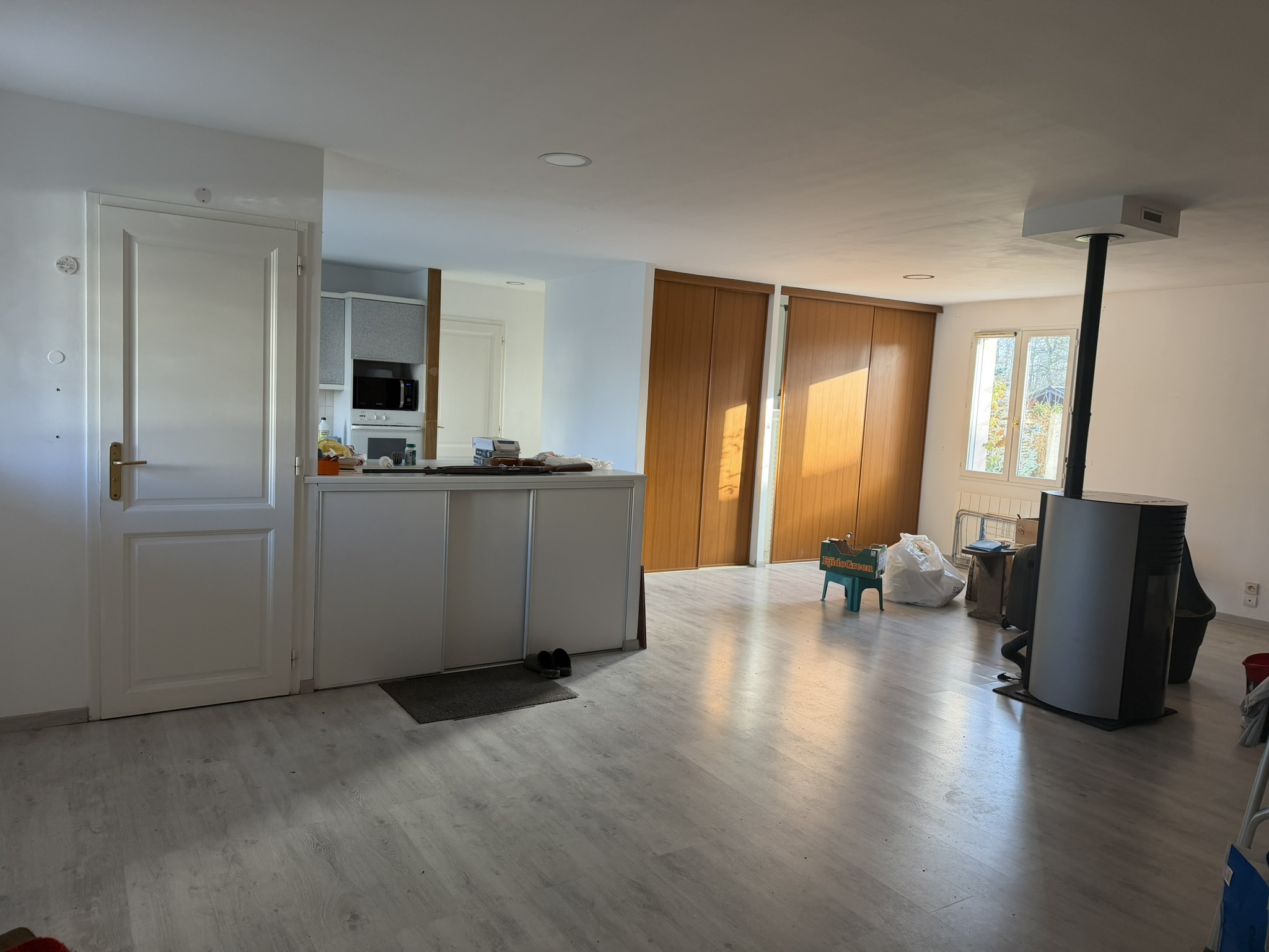 Maison individuelle en bon état comprenant entrée sur grand séjour-salon avec poele à granulés et donnant sur belle terrasse carrelée, cuisine ouverte aménagée et équipée, pièce à usage de bureau/salon avec chambre en mezzanine, arrière cuisine/cellier, une chambre avec salle de bains privative, wc.